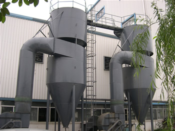 拋光廢氣經(jīng)排風罩、排風總管收集經(jīng)引風機的抽吸作用,廢氣以大于20m/s的風μ速切線進入復(fù)合旋風噴霧除塵器。旋風噴霧復(fù)合除塵器由第一級螺旋面進口型旋風除塵器和第二級噴霧濕式除塵器串聯(lián)組成。含塵氣體切向進入除塵器后依靠圓筒頂部的螺旋型端板。使環(huán)形空間的氣流呈近似10°的傾角強制向下做螺旋運動,使粉塵不能在頂部集中而形成塵莉環(huán)-上灰環(huán),又能避免相鄰兩螺旋圈的氣流相互干擾,高濃度,粗顆粒(>20μm以上)粉塵得以凈化。從旋風除塵器中心管出來的氣體(含塵濃度低,但顆粒細5-20μm以上)進入噴霧凈化器,凈化器內(nèi)分層布置了氣流分布板、網(wǎng)格狀填料、氣流改向和霧化噴頭,小于20μm的粉塵經(jīng)高度霧化的水滴濕潤增重被捕集下來,總除塵效率η>96。